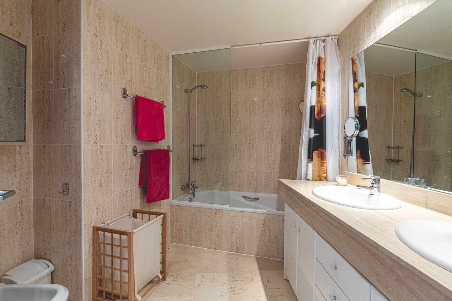 • badkamer met dubbele wastafel, bad/douche combinatie, bidet, toilet en haardroger