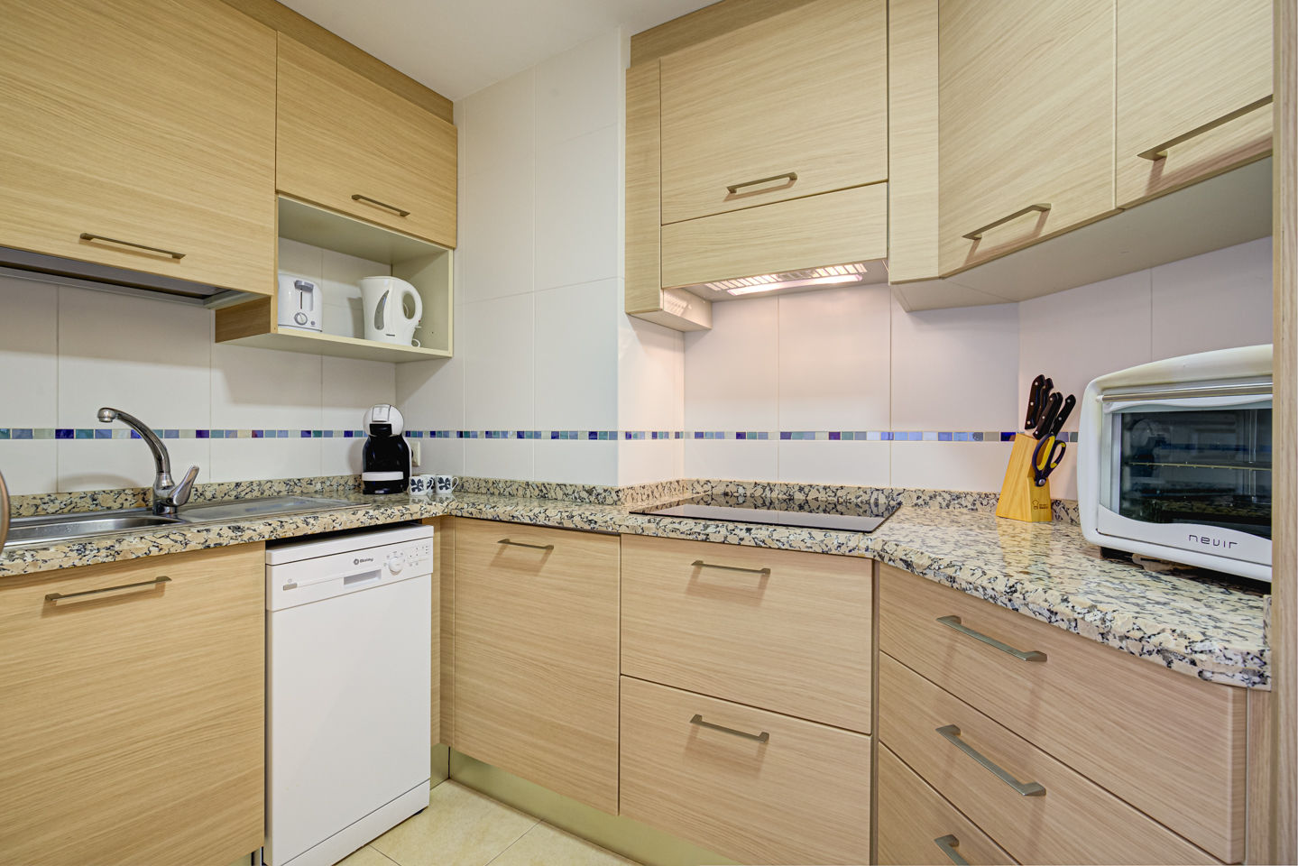 • open keuken met elektrische kookplaat, magnetron, vaatwasser, koelkast-vriescombinatie, koffiezetapparaat, waterkoker, toaster en sapcentrifuge