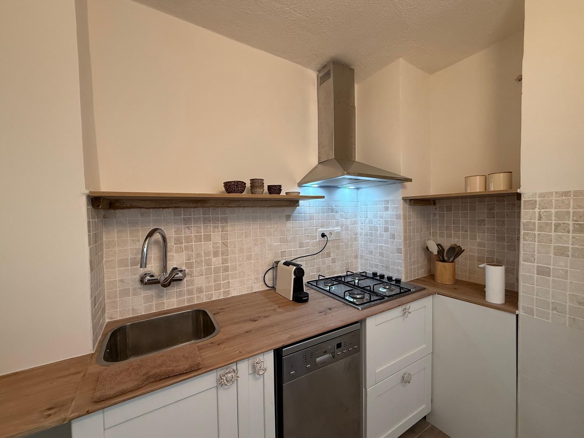 • open keuken met elektrische kookplaat, elektrische oven, magnetron, vaatwasser, koelkast-vrieskast, koffiemachine, mixer, toaster en juicer