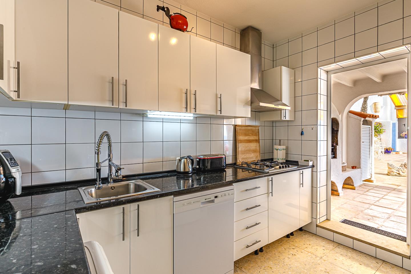 • keuken met gasfornuis, elektrische oven, magnetron, vaatwasser, koelkast, koffiezetapparaat, waterkoker, mixer, toaster en sapcentrifuge