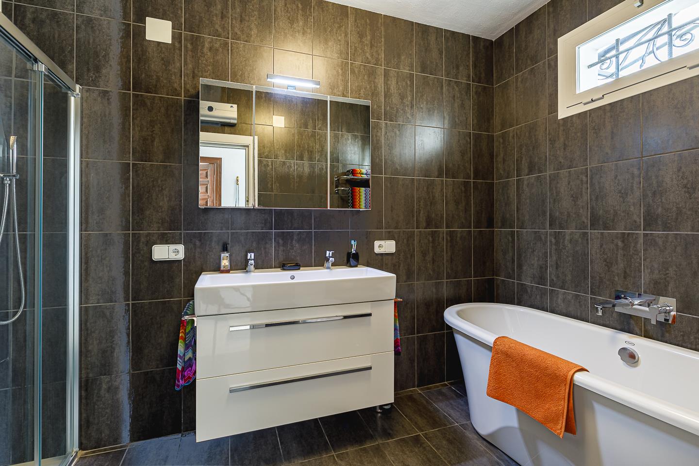 • badkamer met dubbel wastafel, bad, douche, toilet en haardroger