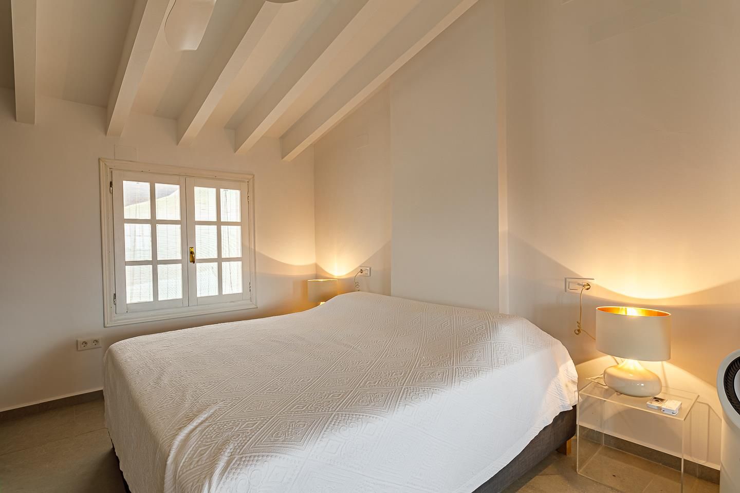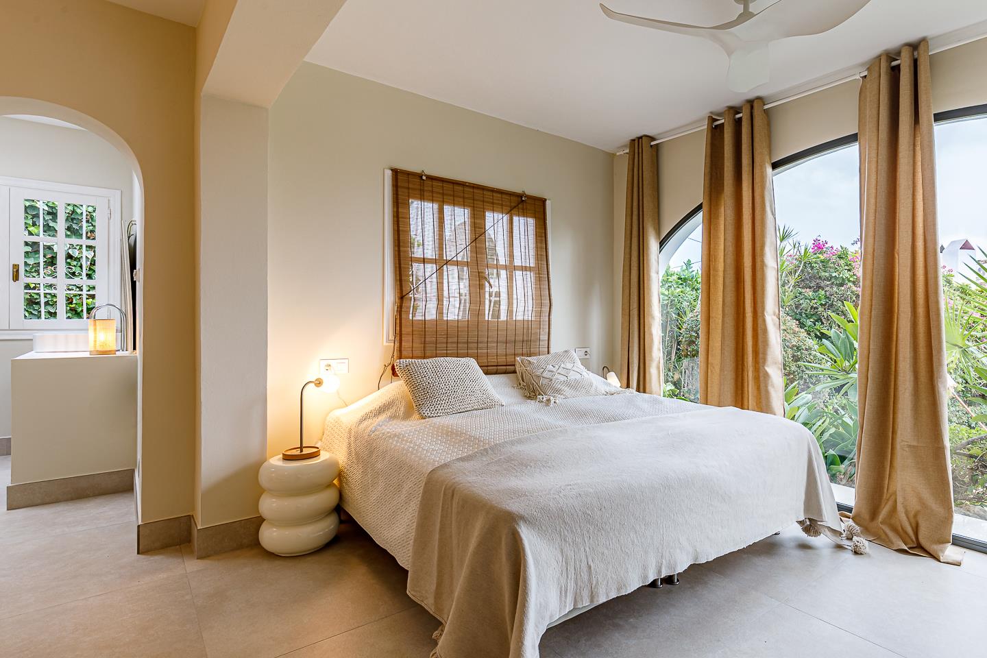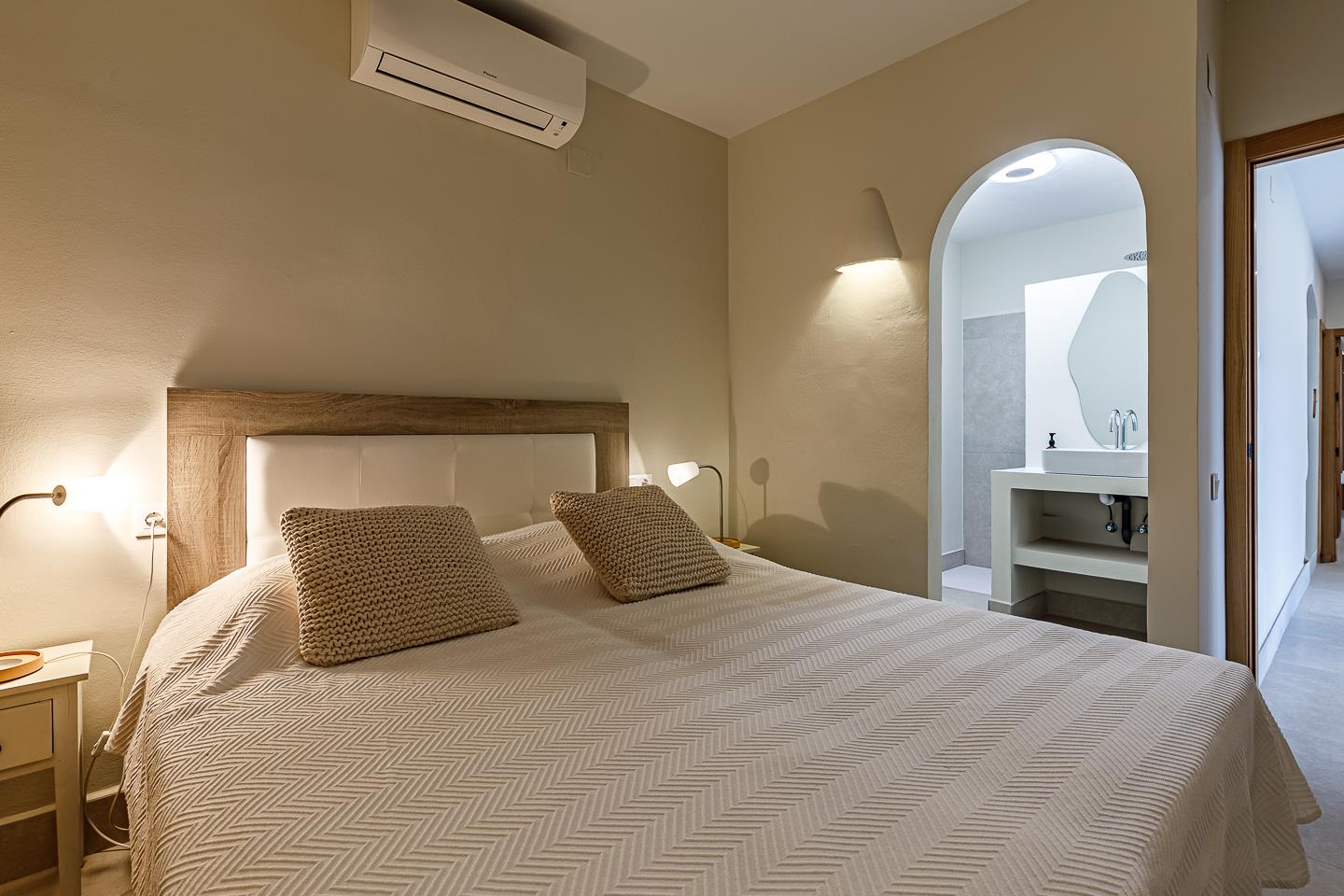 • slaapkamer met een kingsize bed (200 bij 180 cm), ventilator en en-suite badkamer