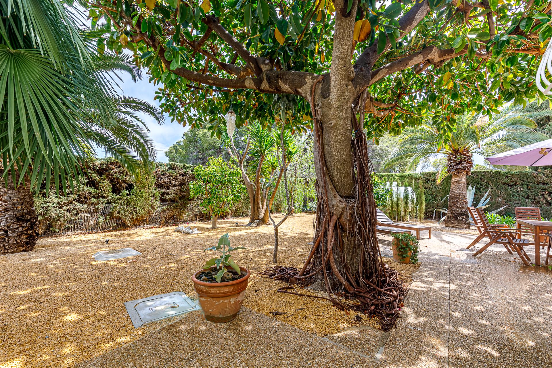 - tuin met grind, bomen en tuinmeubilair met ligbedden