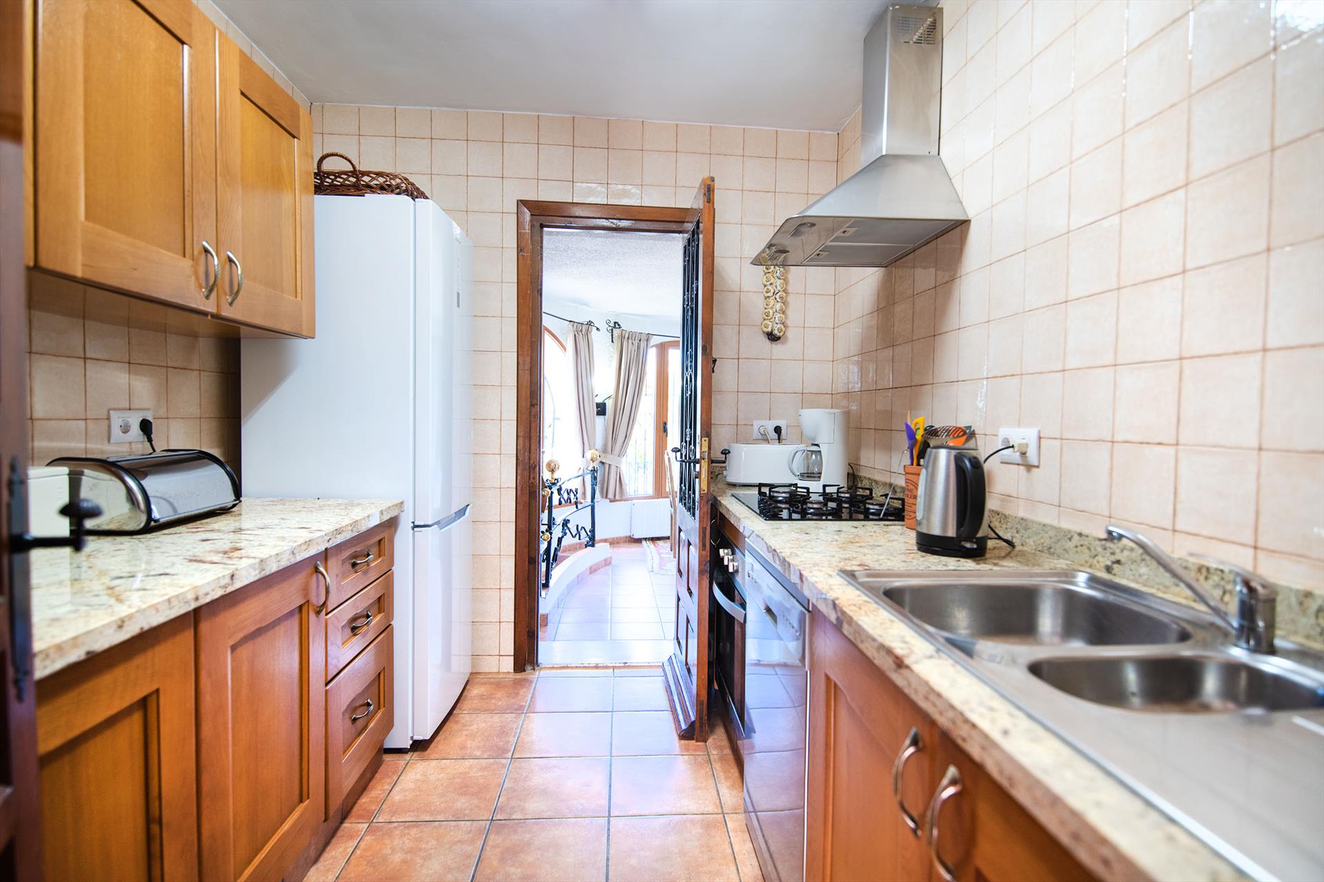 • keuken met gasfornuis, elektrische oven, magnetron, vaatwasser, koelkast-vriescombinatie, koffiezetapparaat, waterkoker en broodrooster