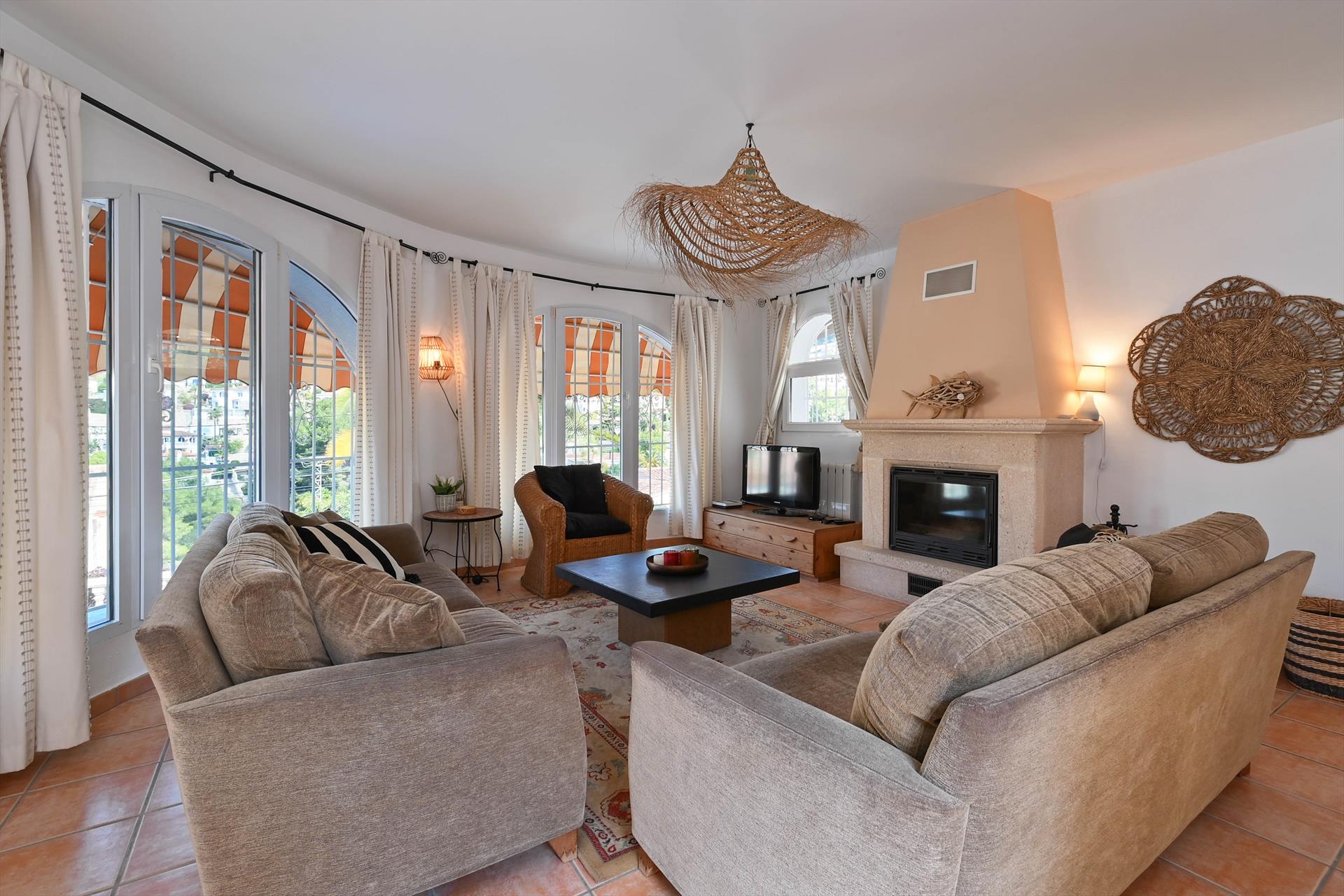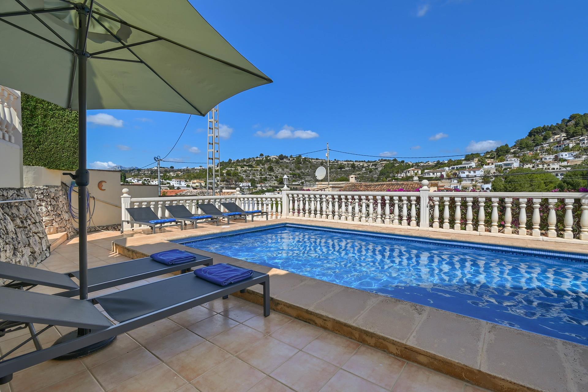 Mooie en gezellige villa met privé zwembad in Benissa, Costa Blanca, Spanje voor 10 personen. De vakantievilla ligt in een heuvelachtige en residentiële omgeving, op 2 km van het strand van Cala Baladrar en op 5 km van Moraira.