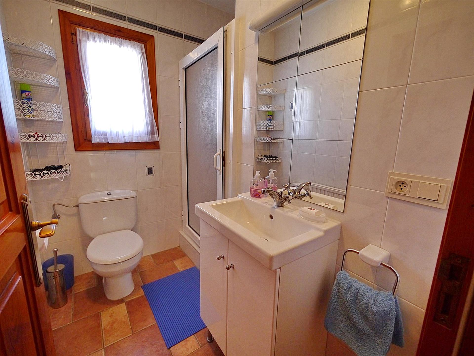 • badkamer met enkele wastafel, douche, en toilet
