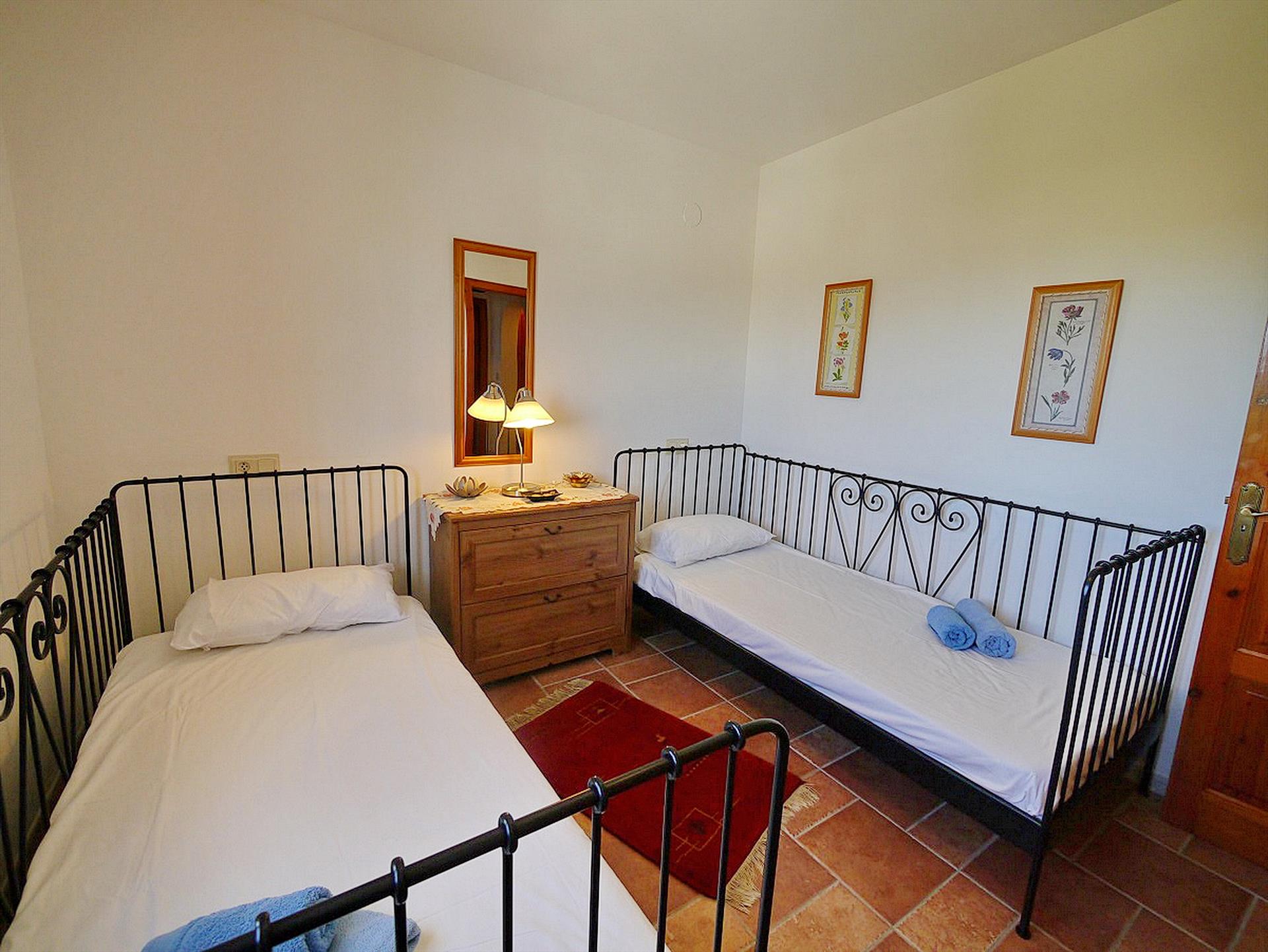 • slaapkamer met airconditioning, 2 eenpersoonsbedden, en ventilator
