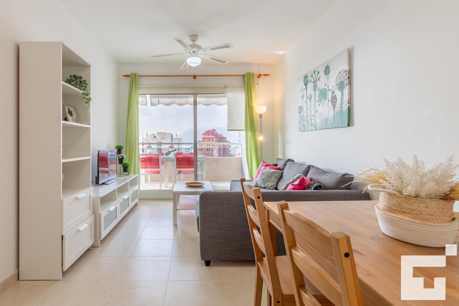 • woon/eetkamer met airconditioning, televisie, slaapbank en plafondventilator