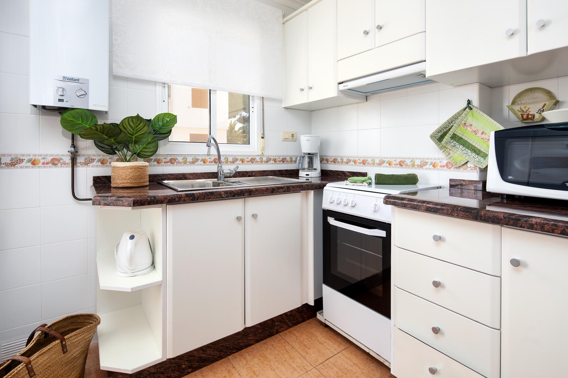 Interieur: Koelkast, oven of elektrische grill, koffiezetapparaat, toaster, waterkoker, strijkijzer, strijkplank en staafmixer.