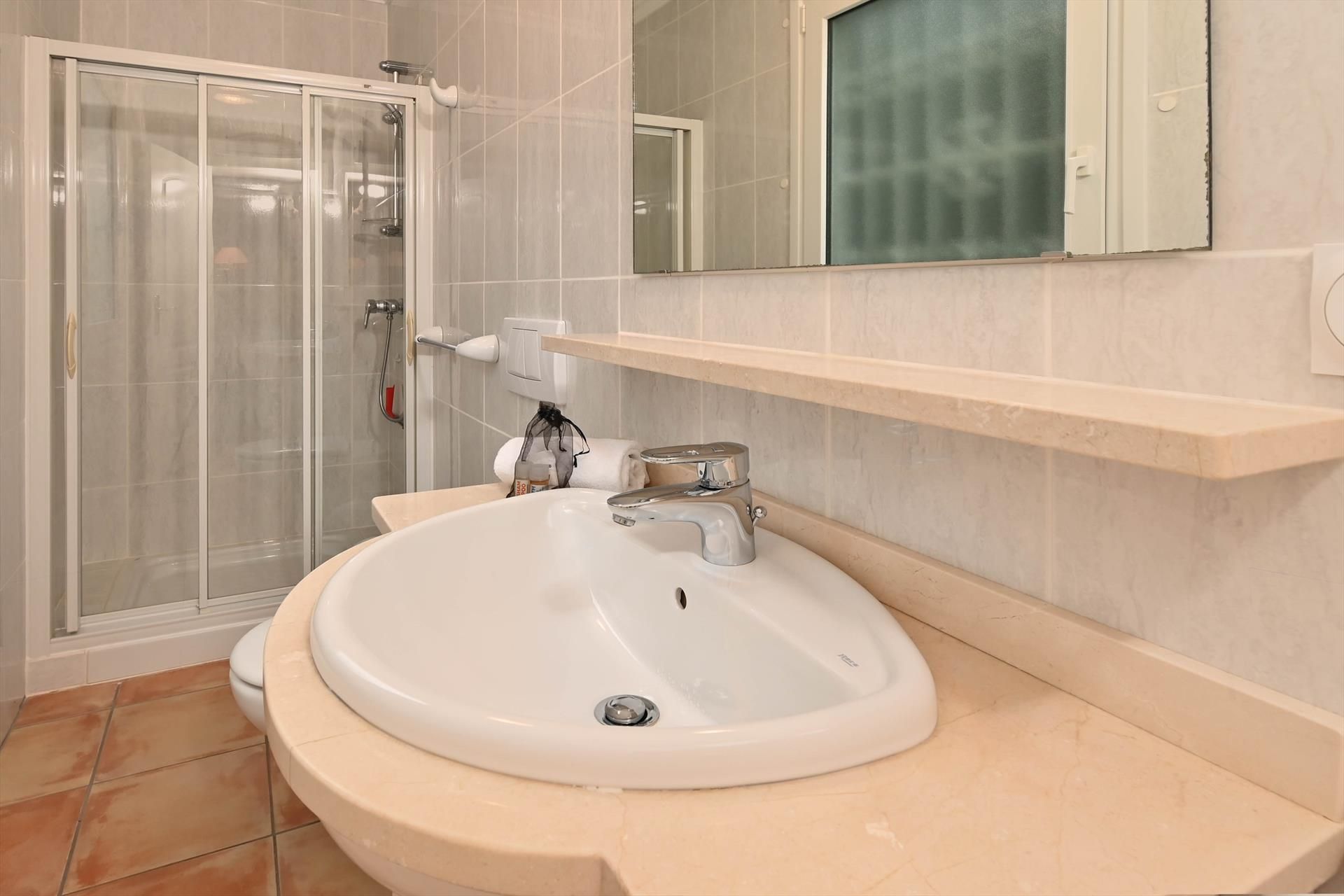 - en-suite badkamer met enkele wastafel, douche en toilet
