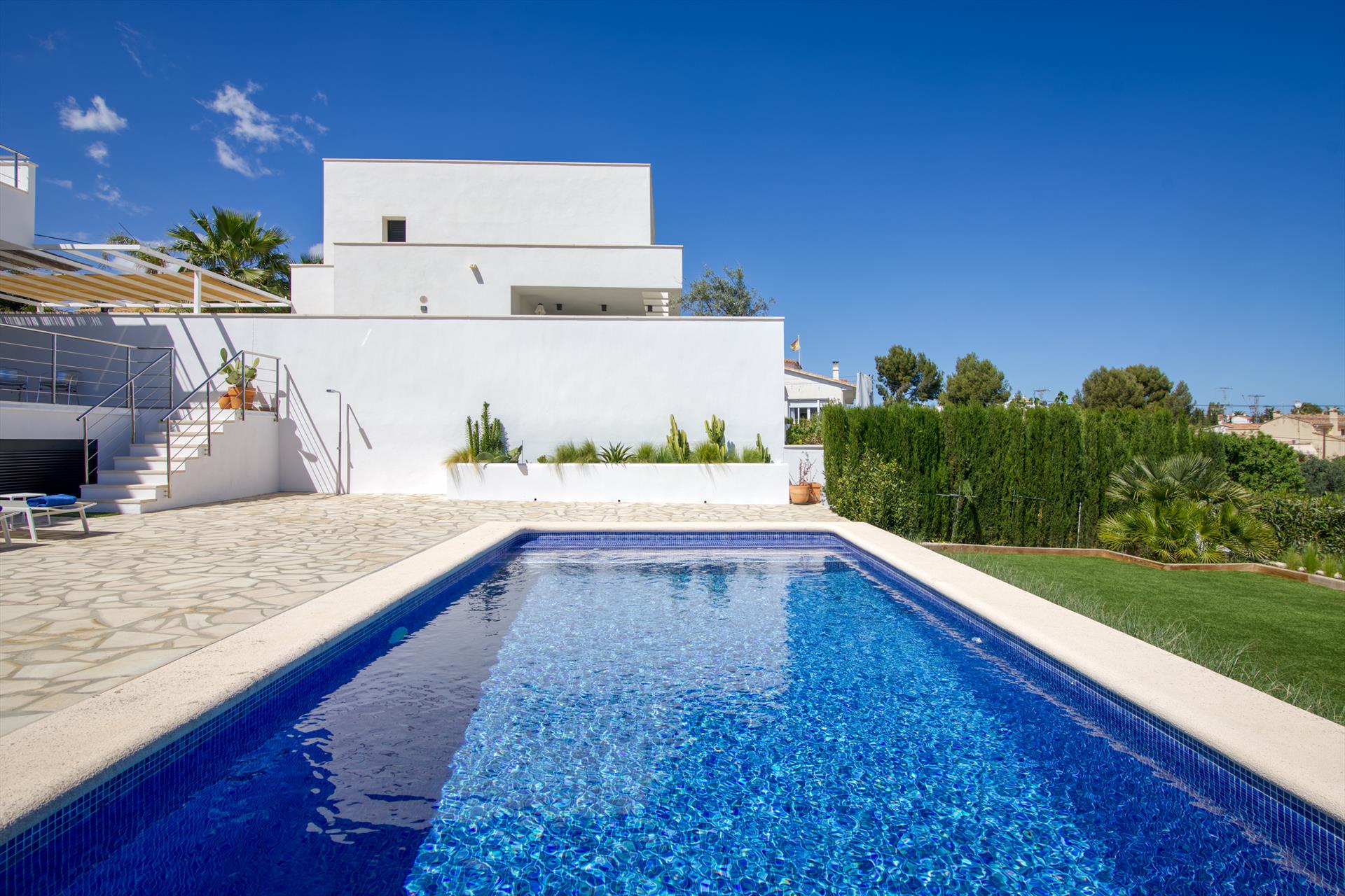 Moderne en luxe villa in Denia, Costa Blanca, Spanje, met een privézwembad voor 6 personen. Het huis is gelegen in een heuvelachtig stedelijk strandgebied en bevindt zich op 2 km van het Marineta Cassiana strand.