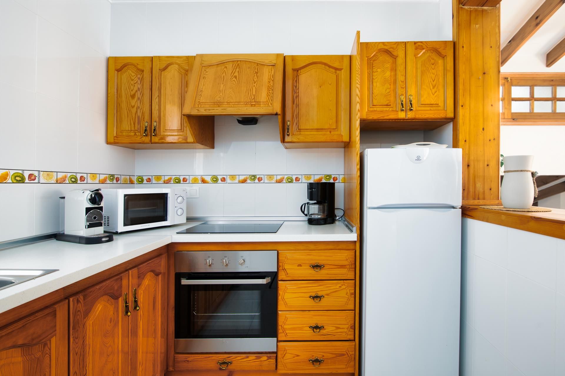 Interieur: Koelkast, oven of elektrische grill, koffiezetapparaat, toaster, waterkoker, strijkijzer, strijkplank en staafmixer.