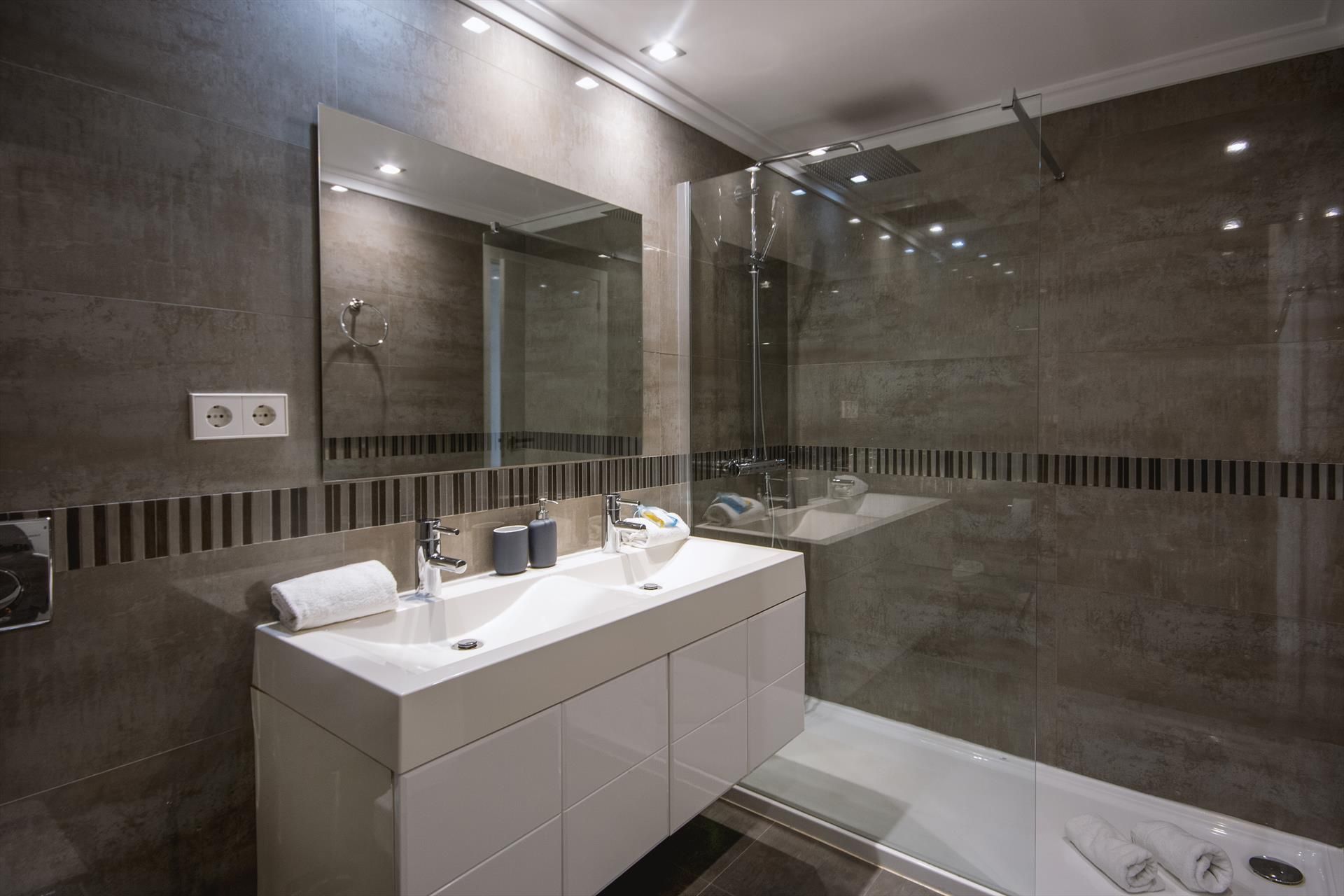 • badkamer en suite met dubbele wastafel, douche, bidet en toilet