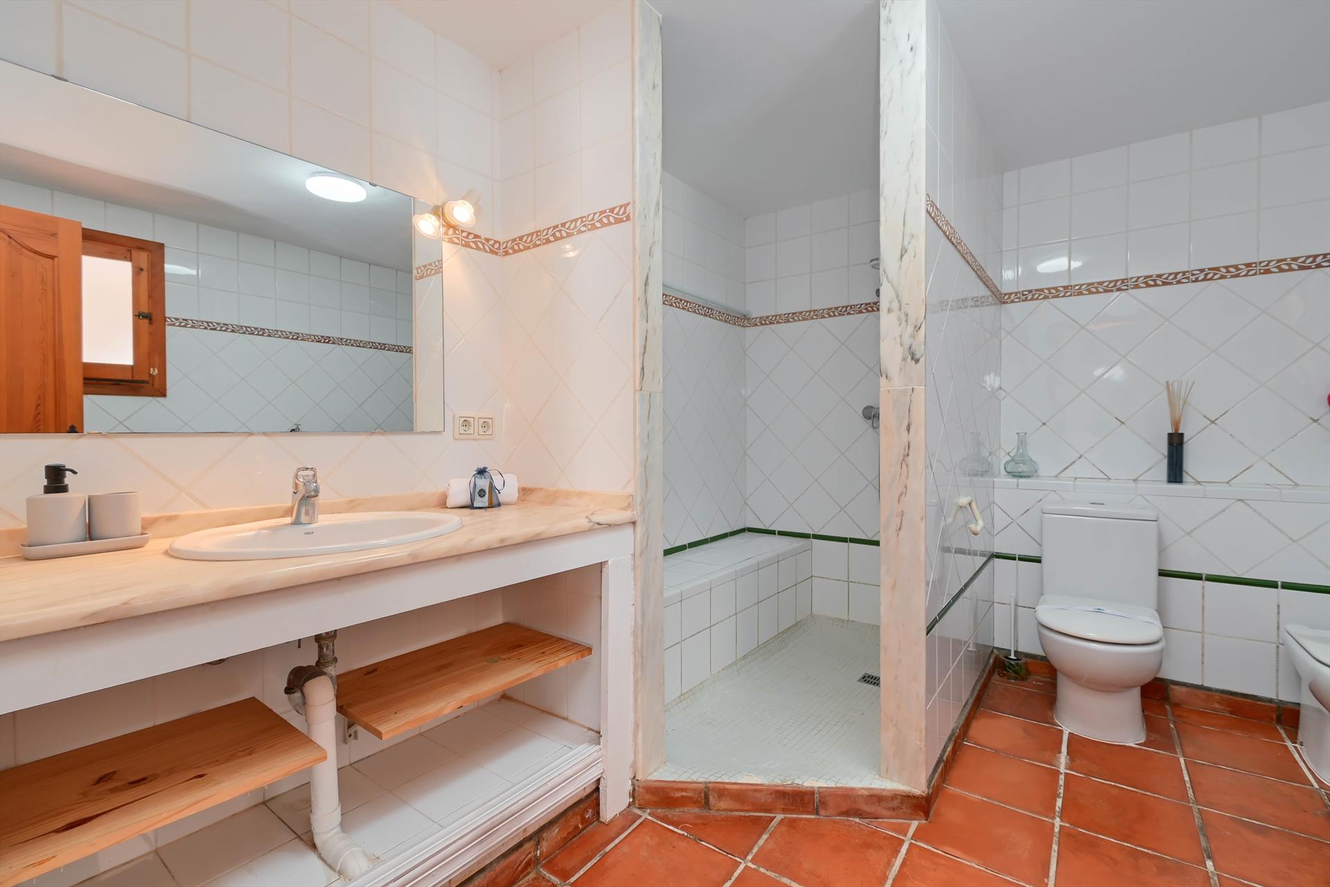 • badkamer en suite met wastafel, douche en toilet