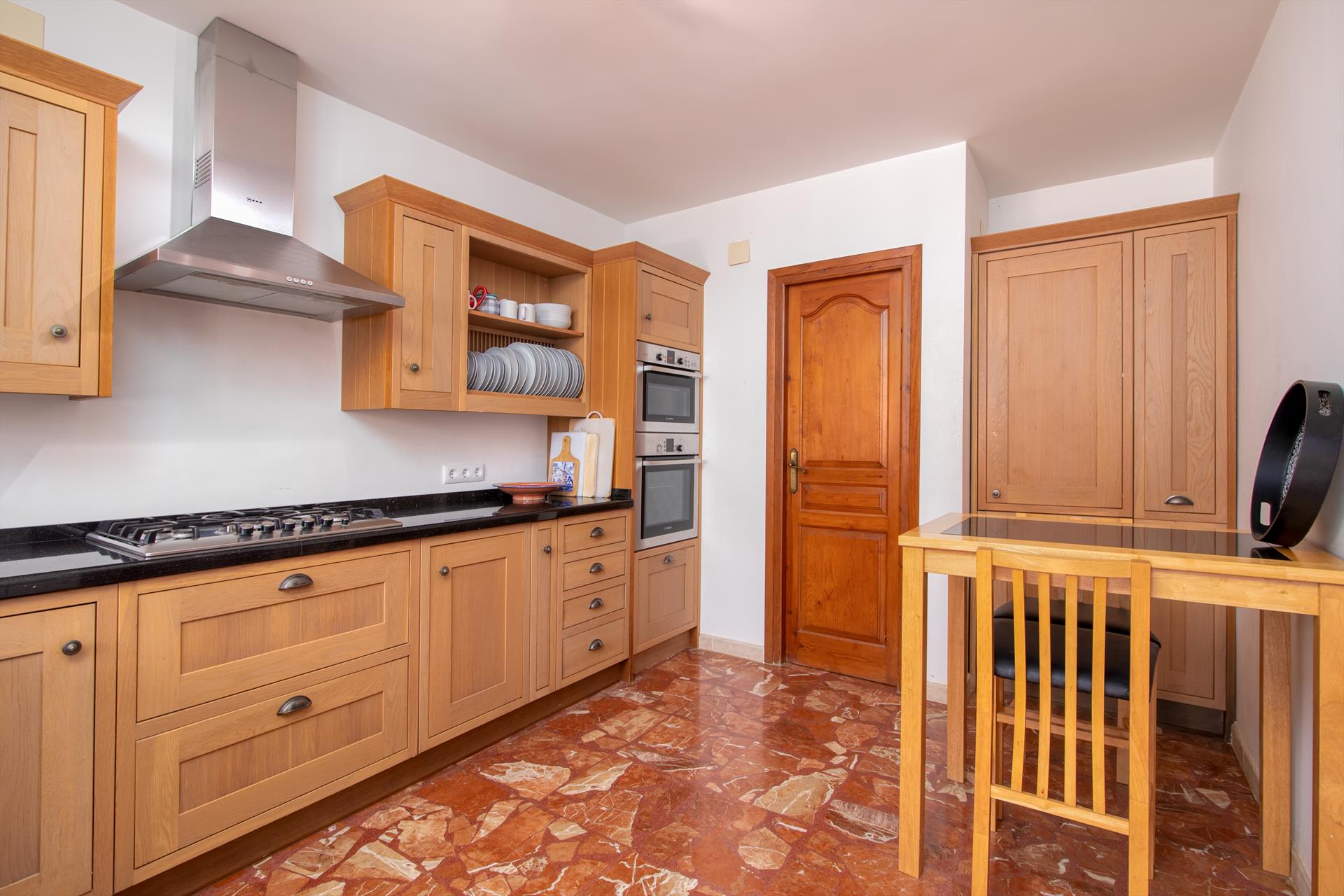 Interieur: Koelkast, oven of elektrische grill, koffiezetapparaat, toaster, waterkoker, strijkijzer, strijkplank en staafmixer.