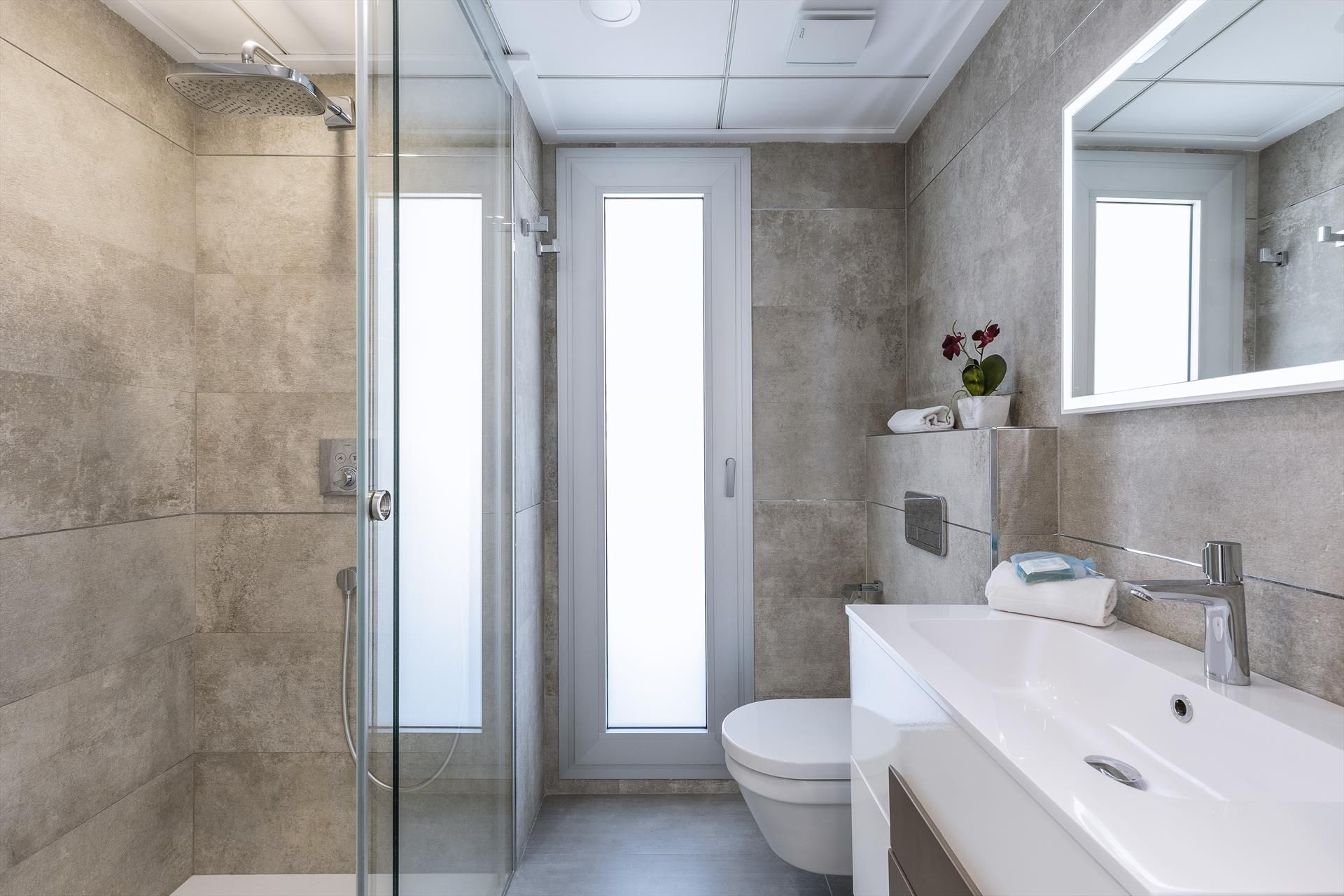 • badkamer met wastafel, douche en toilet