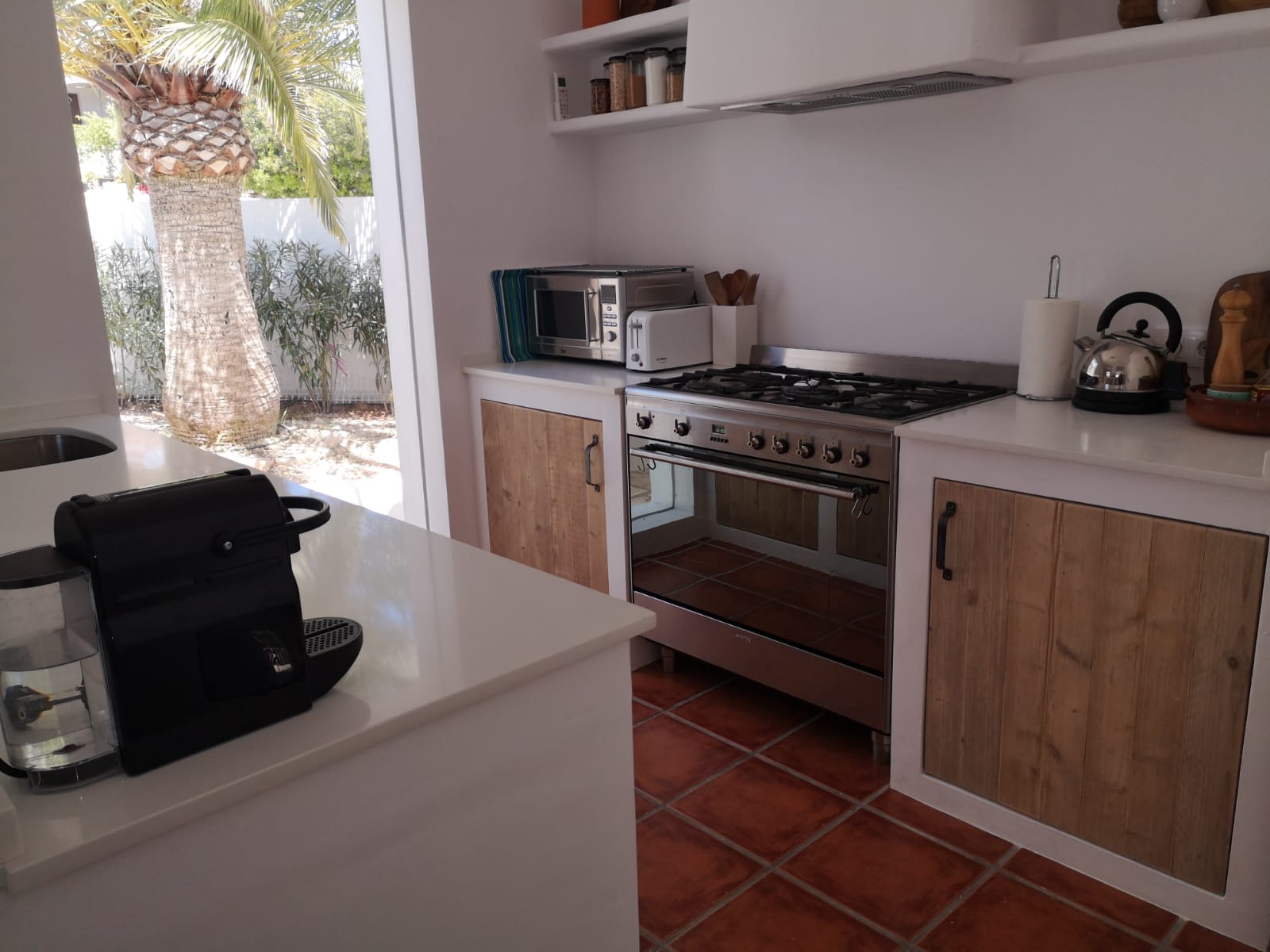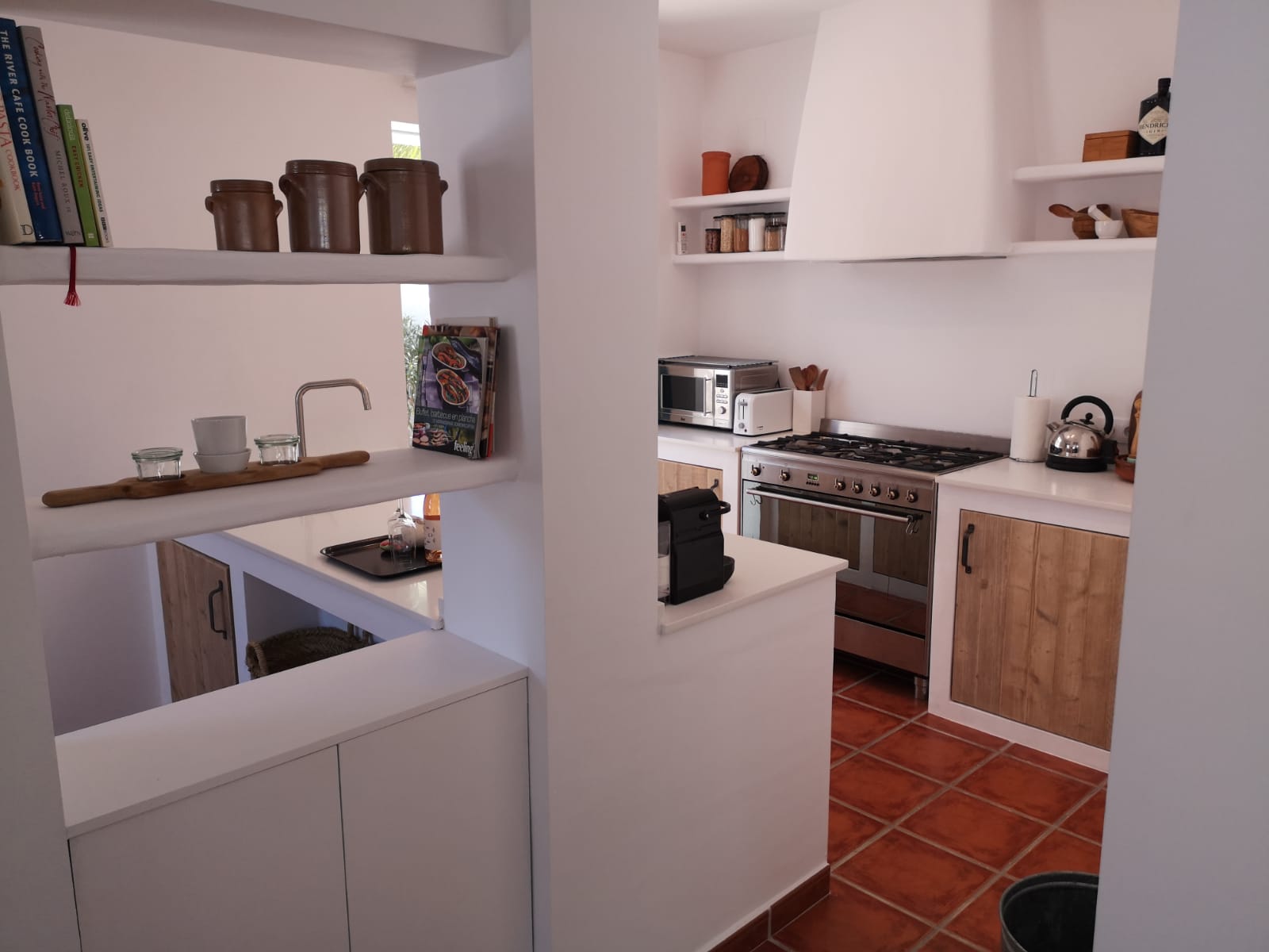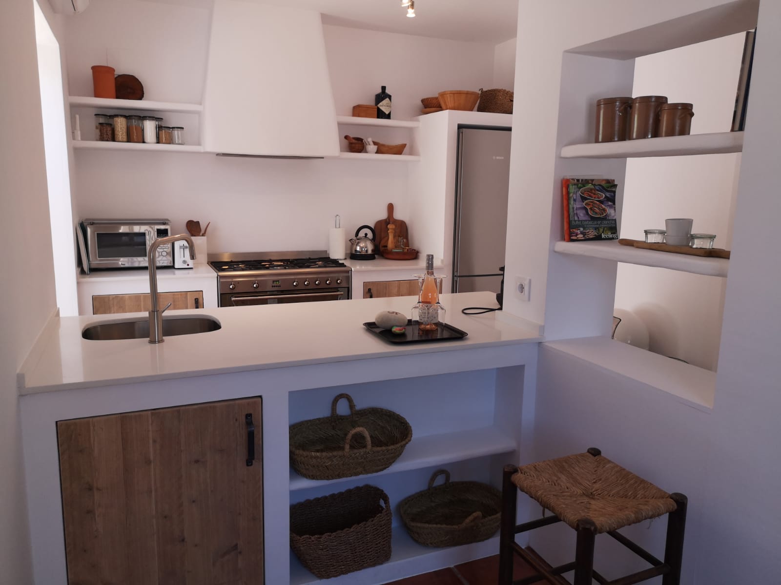 • open keuken met gasfornuis, elektrische oven, magnetron, vaatwasser, koelkast-vriescombinatie, koffiezetapparaat, waterkoker, broodrooster en sapcentrifuge