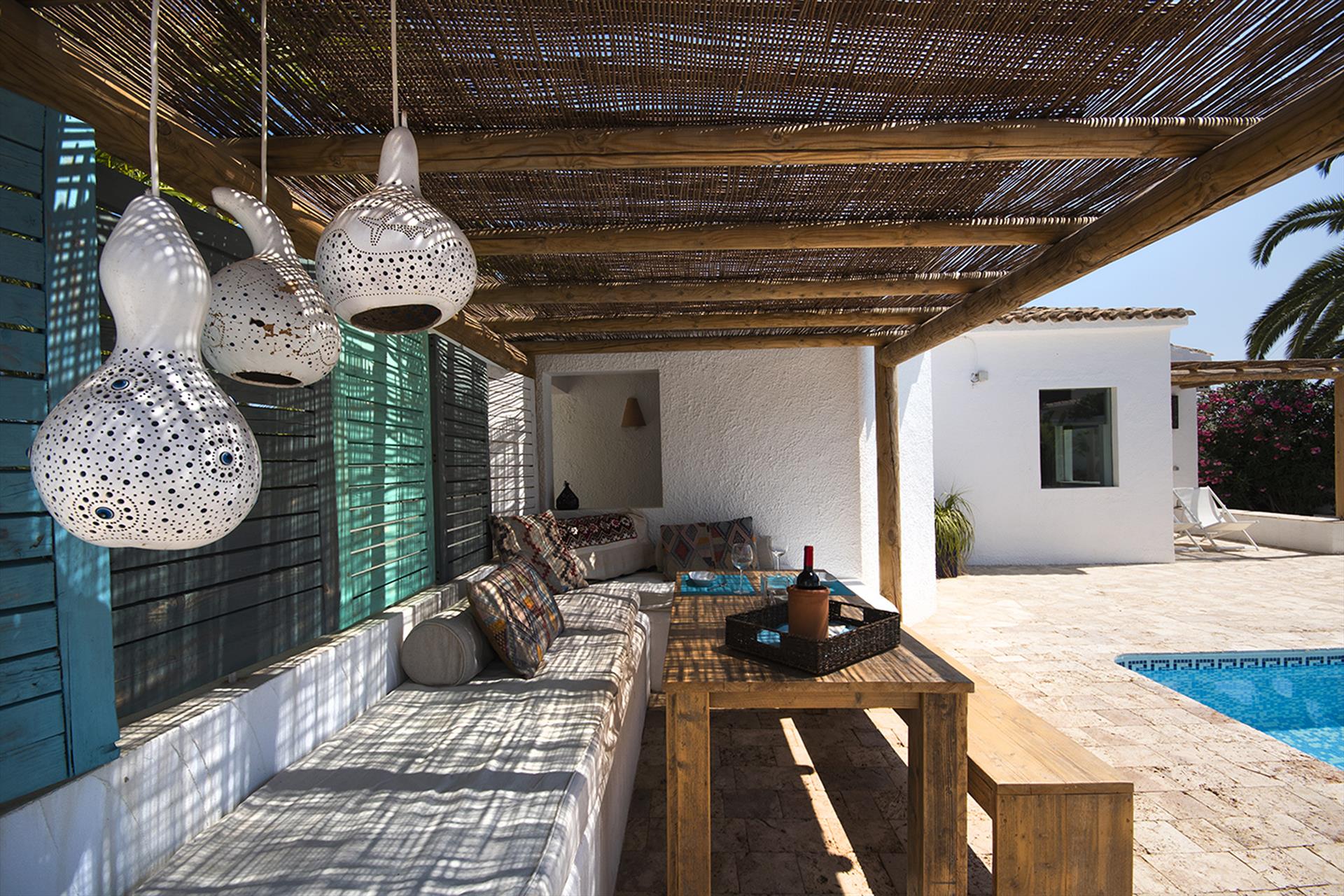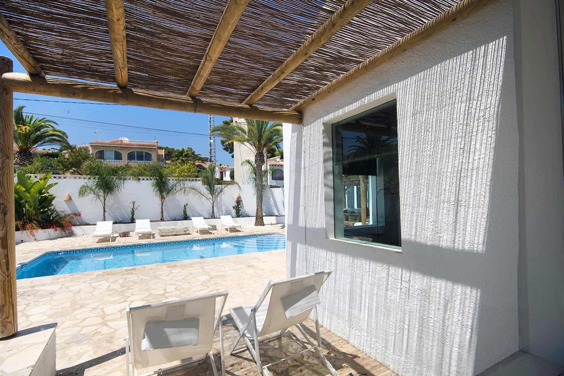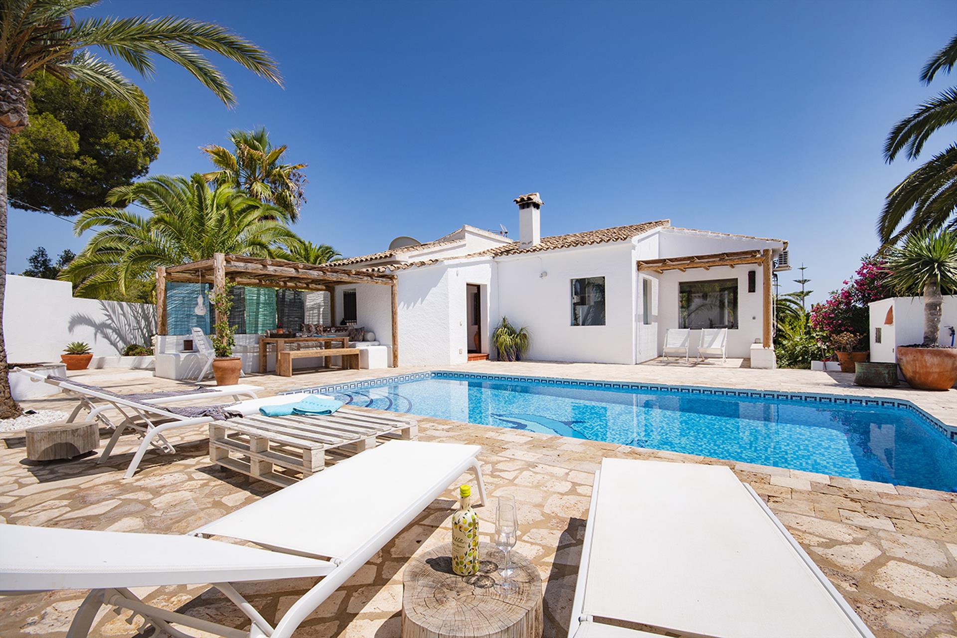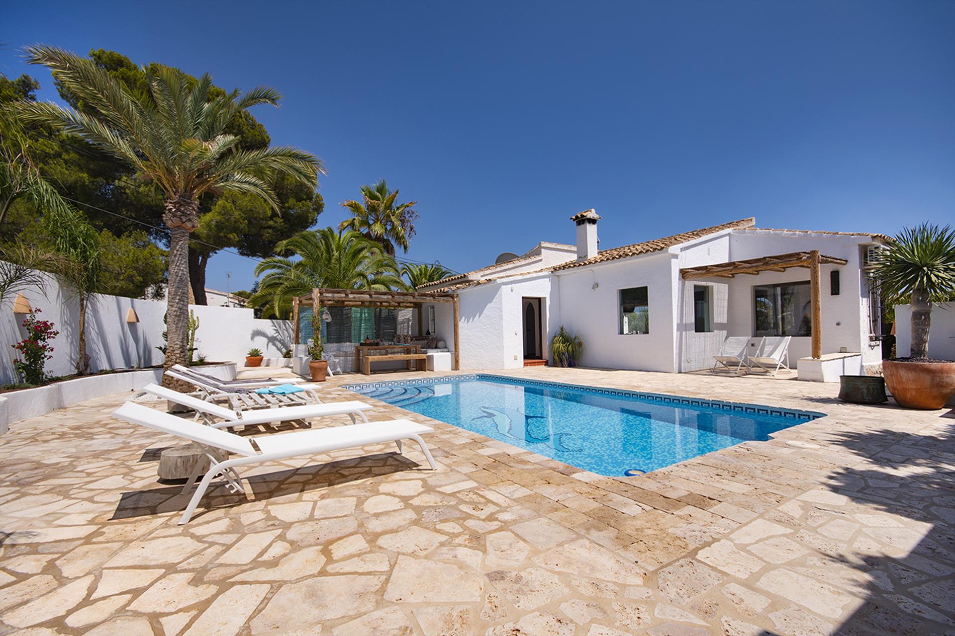 Geweldige en vrolijke villa met privézwembad in Moraira, Costa Blanca, Spanje voor 6 personen. Het huis is gelegen in een residentieel strandgebied en ligt op 2 km van het strand van Moraira.