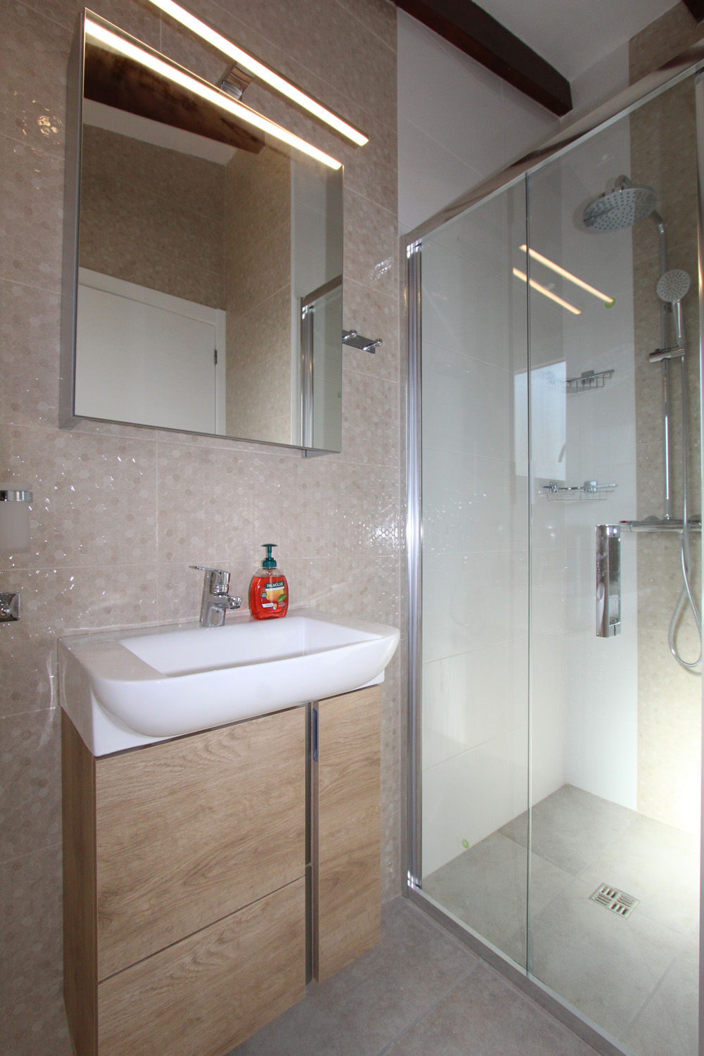 • badkamer met enkele wastafel, douche en toilet