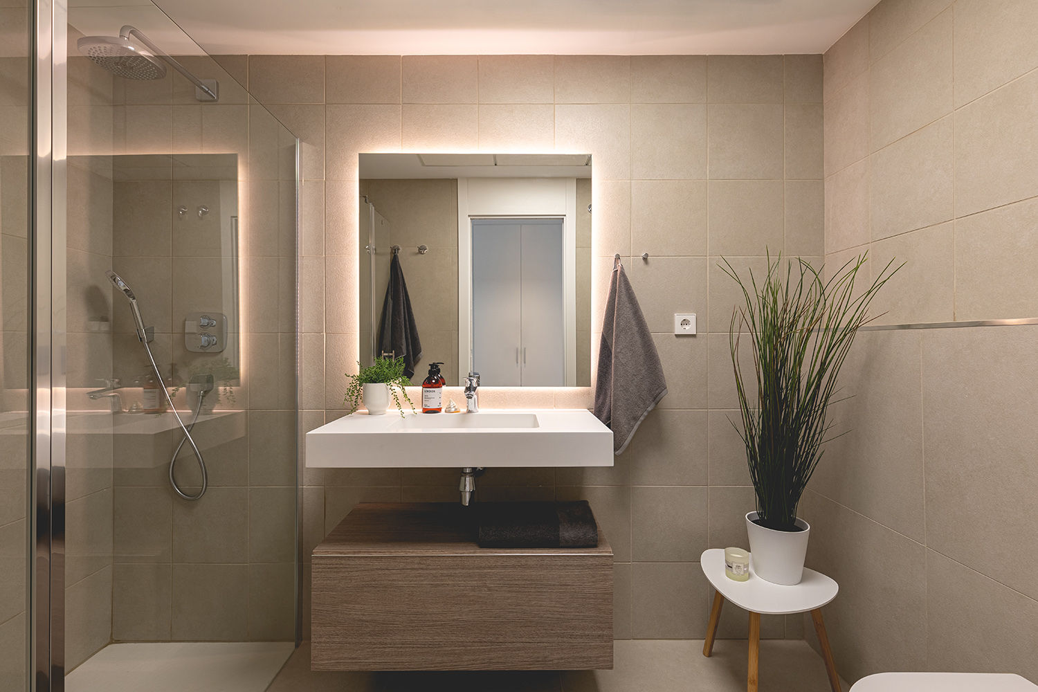 • badkamer met wastafel, douche en toilet